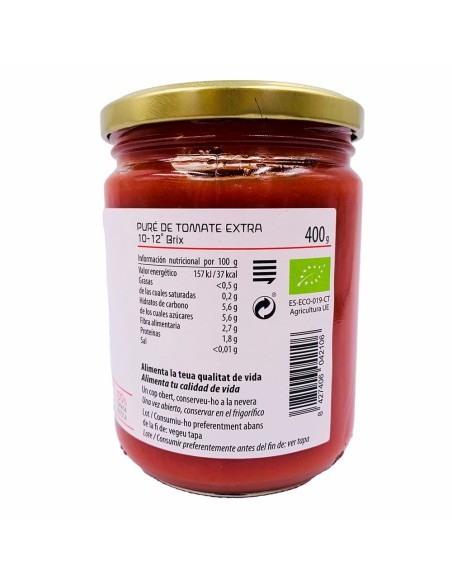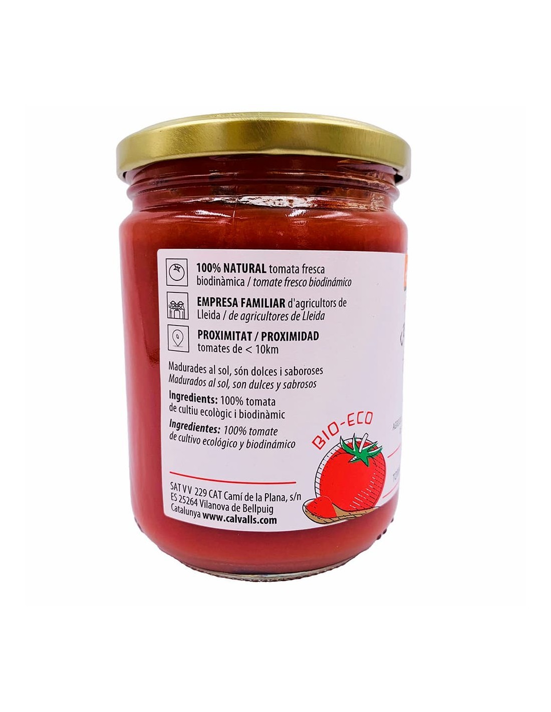 Tomates cultivados en la Plana de Urgell. Madurados al sol, dulces y ricos en vitamina C. Demeter.Ingredientes: 100% Tomate*.*Provenientes de Agricultura Ecológica.