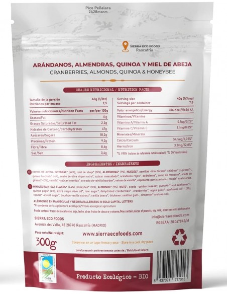 Ingredientes ecológicos: copos de avena integrales(44%), miel de abeja, semillas -lino dorado, calabaza y girasol, almendras (9%), nueces, quinoa hinchada(4%), aceite de oliva virgen extra, azúcar mascabado, arándanos rojos (3%), vainilla, canela y sal marina.