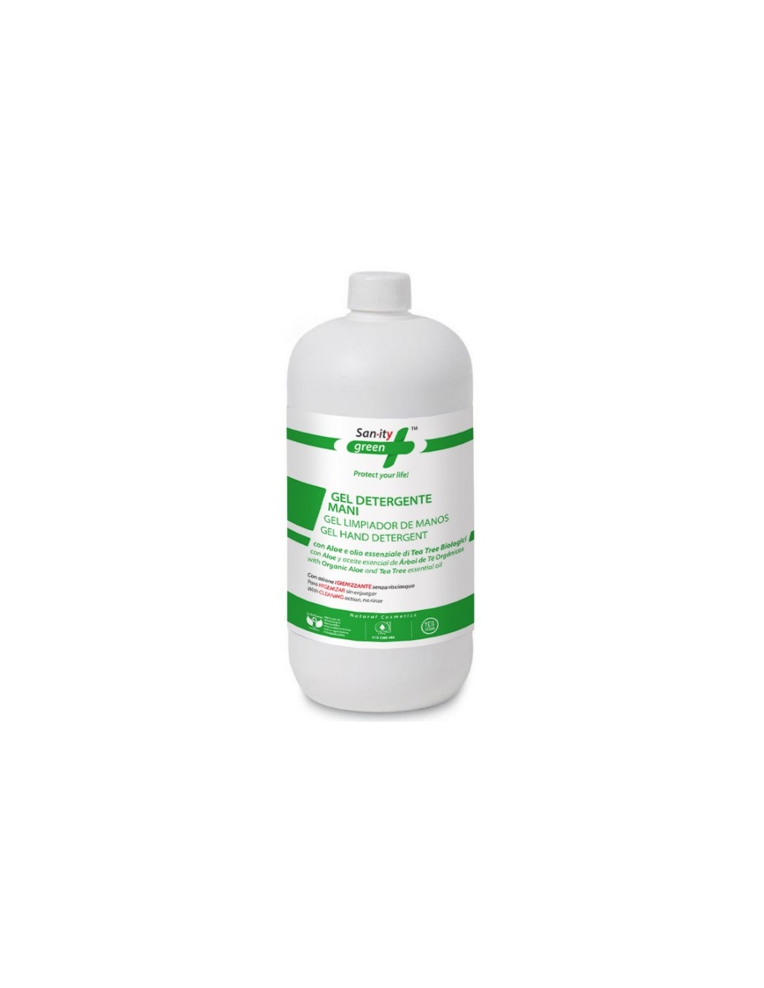 Gel higienizante de manos con aceite esencial de árbol de te y aloe vera. 60% de alcohol. Práctico formato de 1 litro para reposición del formato con dosificador.
