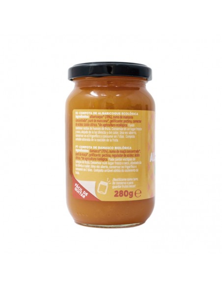 Compota de albaricoque procedente de agricultura ecológica certificada. Obtenida de la cocción de la fruta y su mezcla con concentrado de manzana. Con un mínimo de un 60-70% de la mejor fruta. Compota untable ideal para el desayuno o la merienda. Perfecta también para la elaboración de postres. Sin azúcares añadidos.