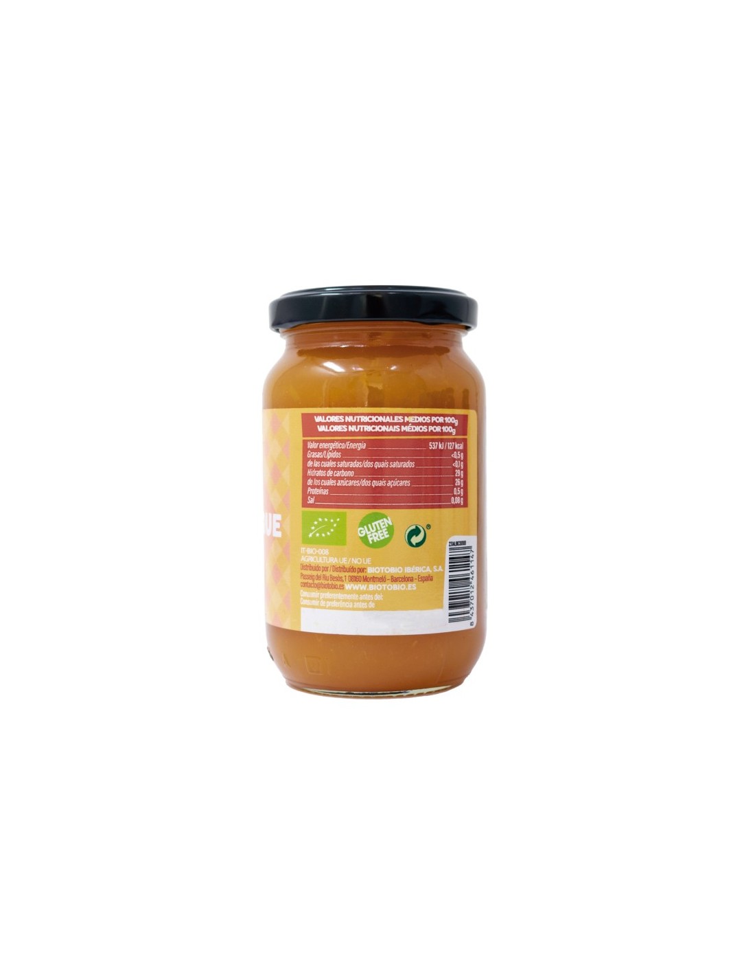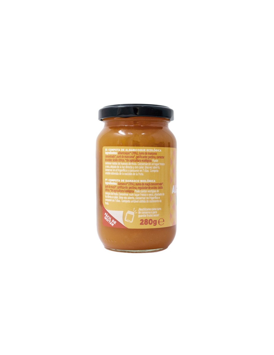 Ingredientes: Albaricoque* (70%), zumo de manzana concentrado*, puré de manzana*, gelificante: pectina, corrector de acidez: ácido cítrico.
