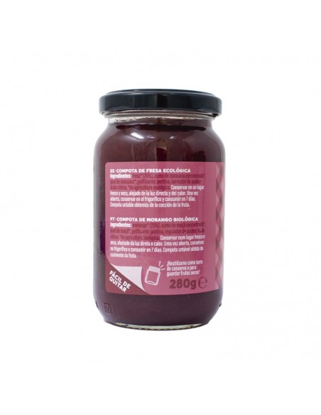 Compota de fresa procedente de agricultura ecológica certificada. Obtenida de la cocción de la fruta y su mezcla con concentrado de manzana. Con un mínimo de un 60-70% de la mejor fruta. Compota untable ideal para el desayuno o la merienda. Perfecta también para la elaboración de postres. Sin azúcares añadidos.