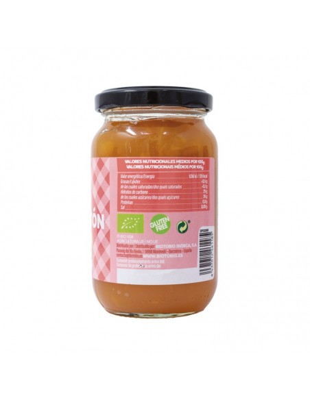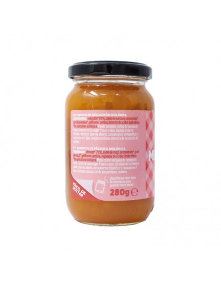 Compota de melocotón procedente de agricultura ecológica certificada. Obtenida de la cocción de la fruta y su mezcla con concentrado de manzana. Con un mínimo de un 60-70% de la mejor fruta. Compota untable ideal para el desayuno o la merienda. Perfecta también para la elaboración de postres. Sin azúcares añadidos.
