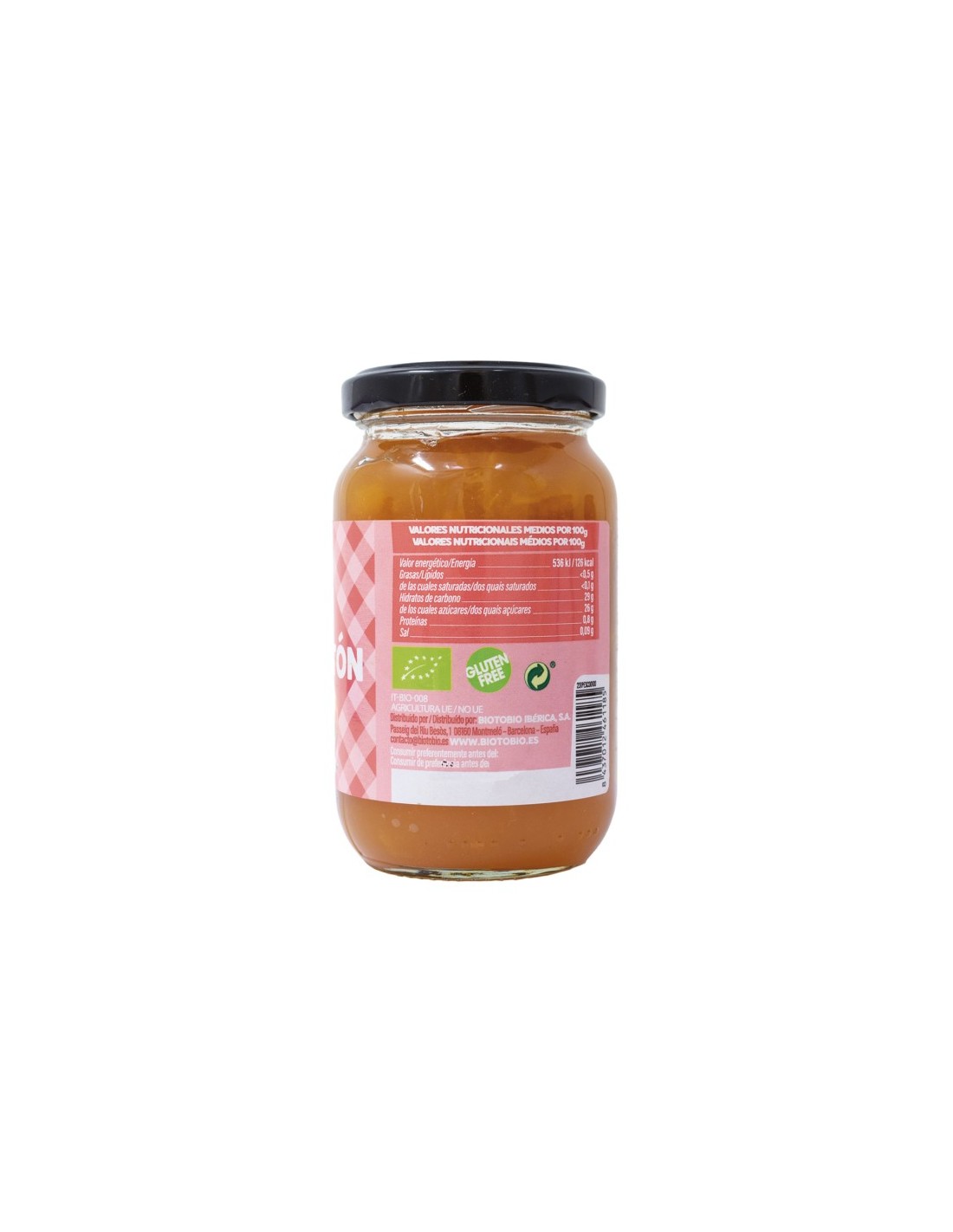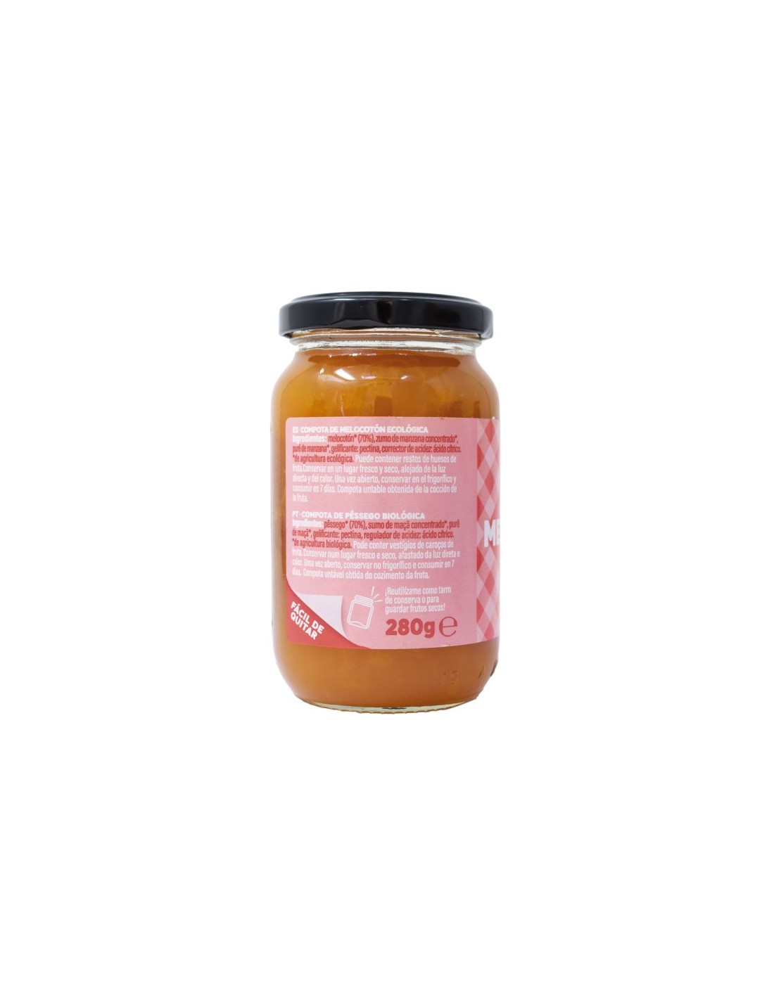 Melocotón* (70%), zumo de manzana concentrado*, puré de manzana*, gelificante (pectina), corrector de acidez (ácido cítrico).