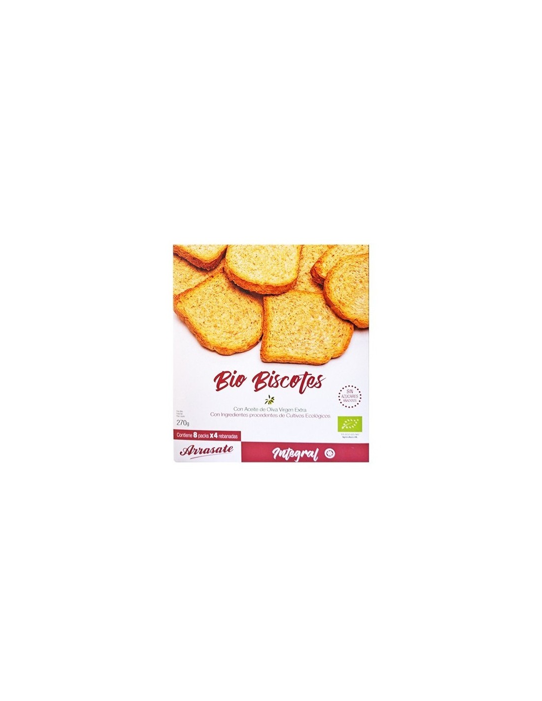 Los biscotes integrales ecológicos se elaboran con harina integral de trigo y aceite de oliva virgen extra. No contienen azúcares añadidos.