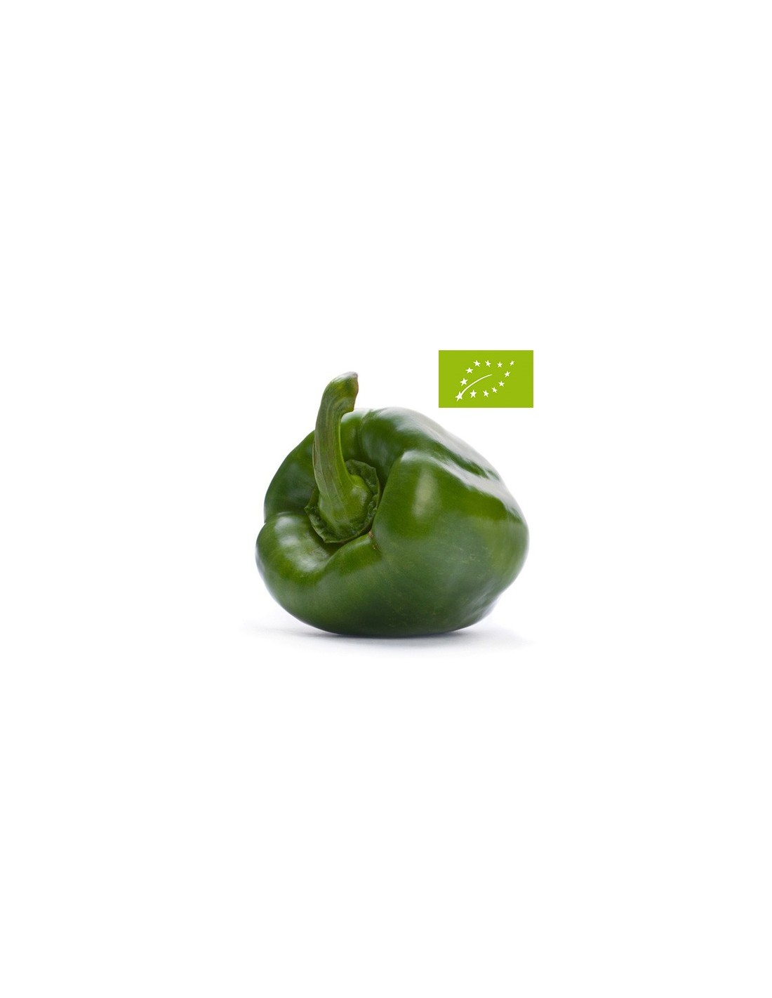 Pimiento verde de california cultivado de forma ecológica sin emplear productos químicos de síntesis ni organismos genéticamente modificados, obteniendo alimentos más saludables y protegiendo el medio ambiente. Se emplea como base para colorantes en alimentos y cosméticos. Se consume fresco y seco y, dependiendo de su preparación se emplean como verdura o condimento.