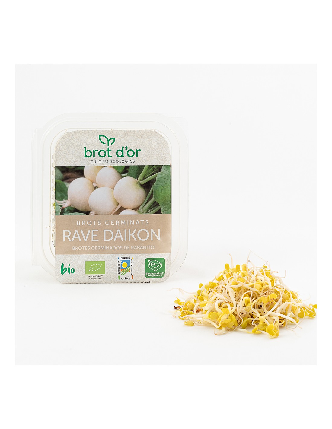 El de la variedad Daikon es el más popular de los dos germinados de rábano que forman parte de la gama de Brot d’Or. Esta hortaliza es muy utilizada la cocina de Asia Oriental en general. De hecho, el nombre de la variedad se podría traducir del japonés como “raíz larga”. Sin embargo, sus orígenes se encuentran en Europa y Asia Continental. También los egipcios lo utilizaban abundantemente en su alimentación y era dieta obligada para los constructores de las pirámides, ya que creían que les daba fuerza e impedía que cayeran enfermos.